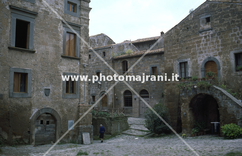 Un angolo pittoresco della "città che muore" costruita su una rupe tufacea che si disgrega. Un'anziana abitante nel centro del borgo