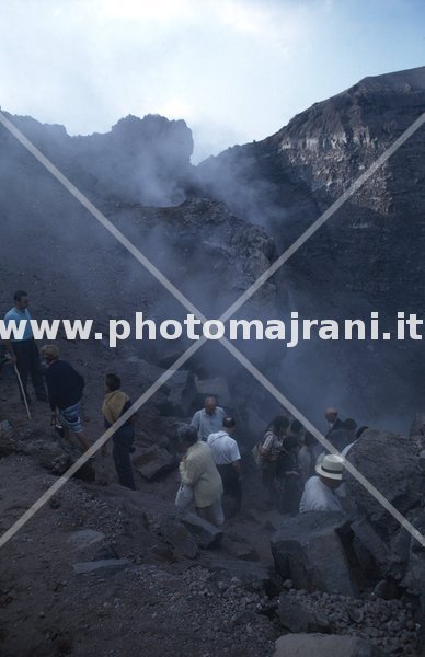 Interno del cratere sommitale del Vesuvio. Un gruppetto di turisti scende lungo il sentiero che porta in fondo.