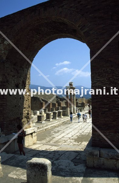 Rovine della città sepolta dalle ceneri del Vesuvio durante l'eruzione del 79 d.C.. Turisti davanti alla "Basilica"